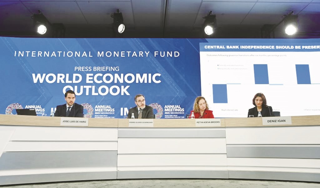 10月14日,在美国华盛顿,国际货币基金组织首席经济学家皮埃尔-奥利维耶·古兰沙(左二)在《世界经济展望报告》新闻发布会上讲话。