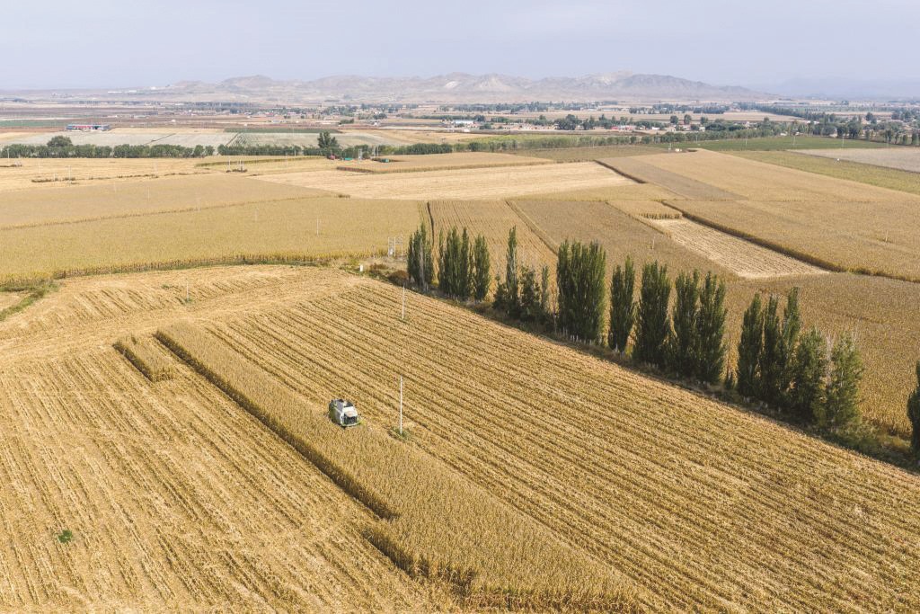 ▲10月15日,在内蒙古巴彦淖尔市乌拉特前旗,农民驾驶农机收割玉米(无人机照片)。