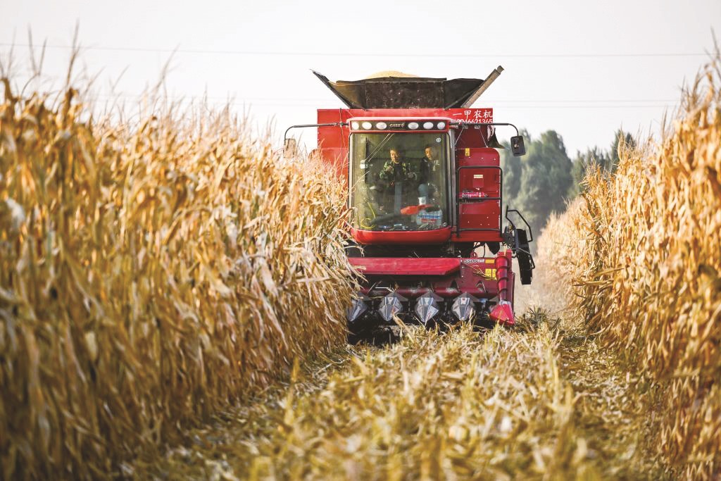 ▲10月14日,在通辽市科尔沁区丰田镇,农机手驾驶收割机收割玉米。 连振/摄