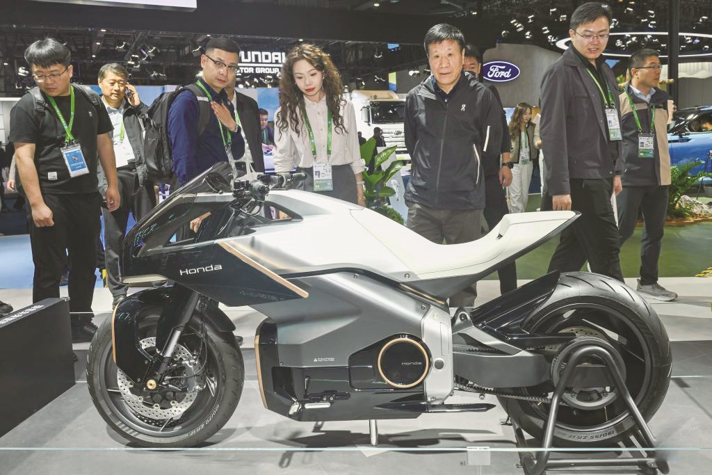 ▲ 11月6日,在第八届进博会汽车及智慧出行展区本田(Honda)展台,观众在围观本田全新电动概念摩托车。 陈浩明/摄