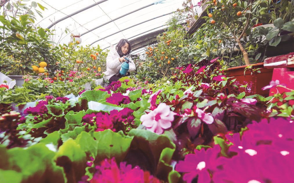 冬日时节,各地农民抢抓农时,积极开展冬季农业生产活动。图为12月18日,农民在河北省遵化市遵化镇张家坎村花卉大棚浇水。