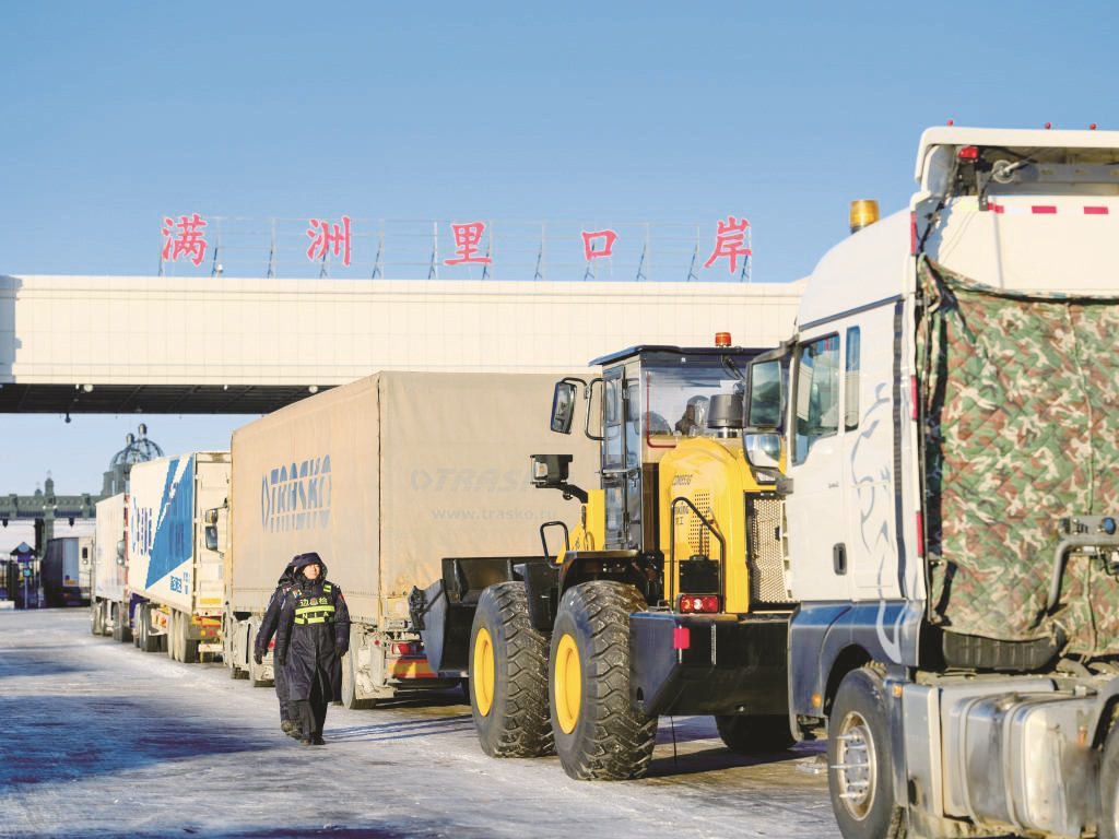 内蒙古自治区满洲里市是具有百年历史的重要中俄口岸城市。随着对外开放不断深化,口岸贸易往来频繁,物流通道日益畅通,城市发展活力持续释放。满洲里出入境边防检查站数据显示,截至12月23日,2025年满洲里口岸出入境人员已超90万人次。图为出境货车排队通过满洲里公路口岸。