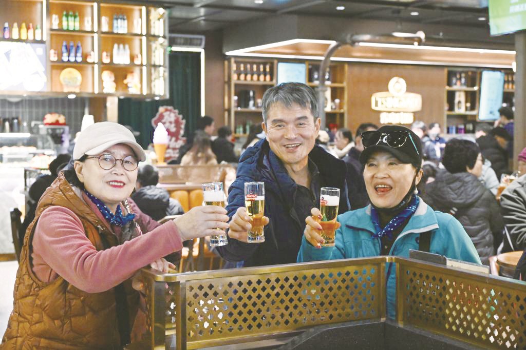 2025年12月31日,几名韩国游客在青岛啤酒博物馆内品尝啤酒。 李紫恒 /摄