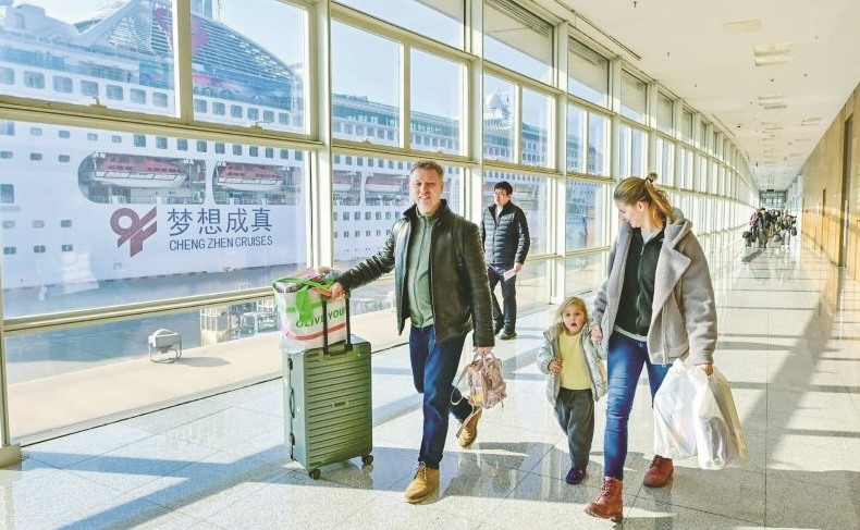 1月3日,游客在天津国际邮轮母港内准备办理入境手续。 杜鹏辉/摄