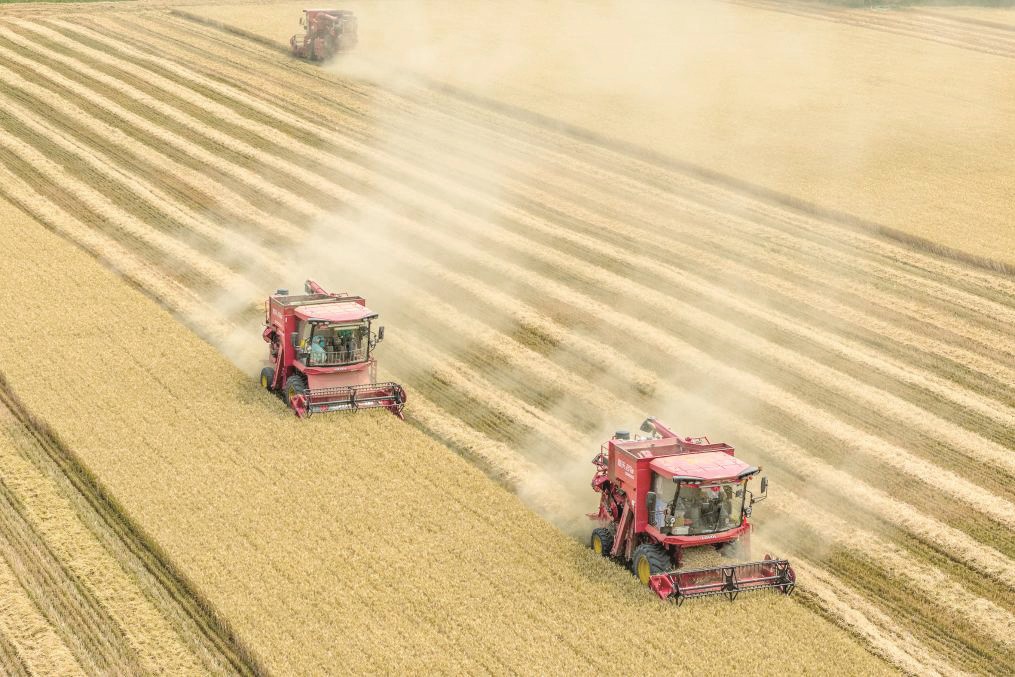 2025年6月9日,河南省三门峡灵宝市西阎乡东古驿村村民在抢收小麦(无人机照片)。 杜杰/摄