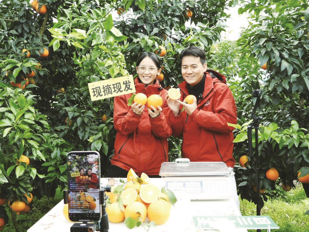 2025年11月18日,在四川省达州市渠县合力镇石燕村柑桔种植基地,工作人员通过直播销售脐橙。 邓良奎/摄