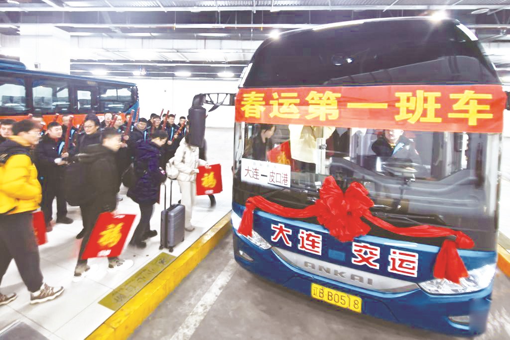 2月2日清晨,旅客在辽宁大连长途汽车站乘坐大连交运集团“春运第一班车”返乡。